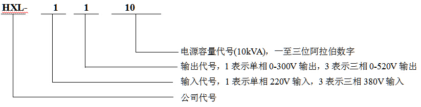如图所示,举例型号是HXL-1110,对应的变频电源规格是10kVA单进单出变频电源,220V单相输入,单相0-300V输出,如果是三进单出变频电源,对应的型号是HXL-3110,380V三相输入,单相0-300V输出,三进三出变频电源,对应的型号是HXL-3310,380V三相输入,三相0-520V输出,型号的命名以此类推。